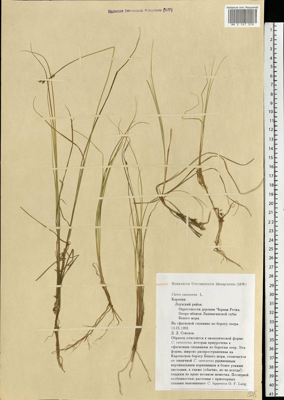 Образец относится к экологической форме C. canescens, которая приурочена к сфагновым сплавинам по берегам озер. Эта форма, широко распространенная на Карельском берегу Белого моря, отличается от типичной C. canescens удлиненным вертикальным корневищем и более узкими листьями, а также (обычно, но не всегда!) ─ гладким по краю носиком мешочка. Последней особенностью растения с приозерных сплавин напоминают C. lapponica O. F. Lang
